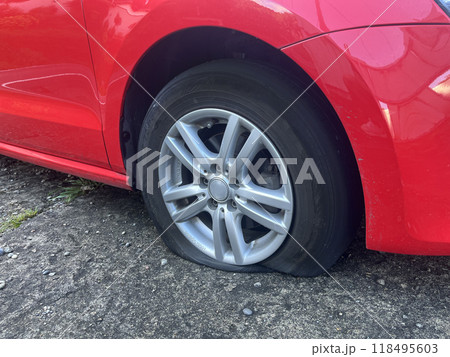 パンクしたタイヤ、乗用車、普通車、旅行、アクシデント、事故