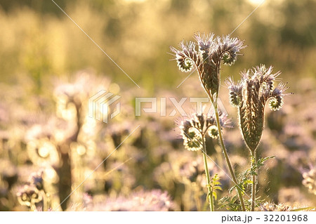 Flowering herbs in the field lit by setting sun