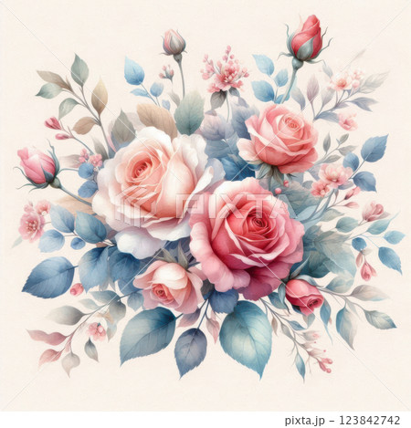 Delicate roses in pink, peach, and cream colors, accented with blue and pink blossoms, form a stunning bouquet against a soft background in this floral masterpiece