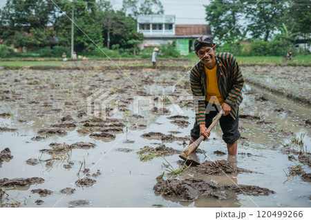 A dedicated rural farmer is cultivating a lush rice field in Indonesias countryside