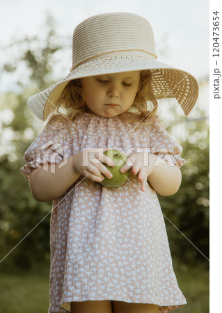 Joyful Girl in a Dress and Straw Hat, Holding an