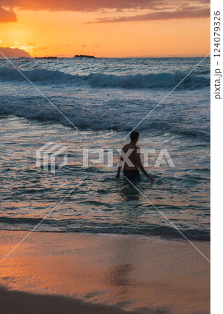 A person wades into the ocean during sunset on a Hawaiian beach. Warm orange and pink hues fill the sky, with landmass visible on the horizon.