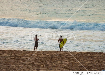 Two individuals stand on a sandy beach, one holding a yellow surfboard, facing the ocean as gentle waves roll in under soft sunrise lighting.