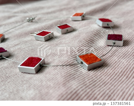 Colorful geometric jewelry necklace with square pendant design on textured fabric background
