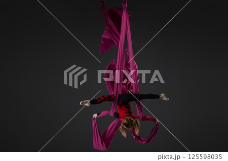 Girl performs aerial fabric acrobatics draped from pole in bold attire