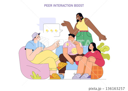 Group of diverse people engaging in animated discussion, expressing ideas with positive body language. Vector illustration captures casual conversation and peer interaction.