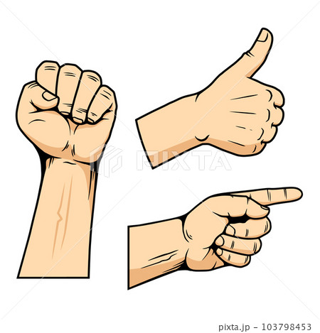 Set of illustrations of human hand with like sign, fist. Design element for emblem, sign, poster, card, banner, flyer. Vector illustration
