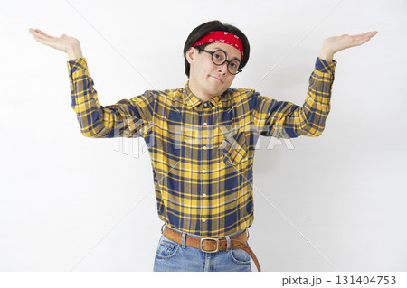 アキバ系の男性 ギブアップのジェスチャー 白背景 カメラ目線