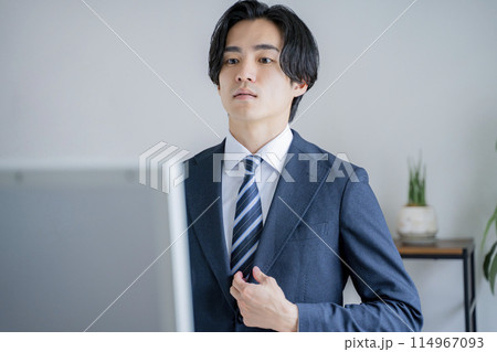 朝出勤前にヘアセットするスーツ姿の若いアジア人男性ビジネスマン