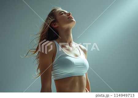 Generative AI The image showcases a young woman with a serene and elegant demeanor, her delicate features complemented by subtle makeup.