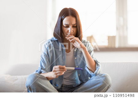 Upset disappointed young european lady holds negative pregnancy test indoor
