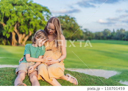 Heartwarming outdoor bonding as a pregnant mom and her son enjoy quality time together, savoring the beauty of nature and creating cherished moments