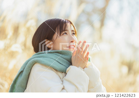 寒がる若い女性 寒い 悪寒 冷え性 屋外