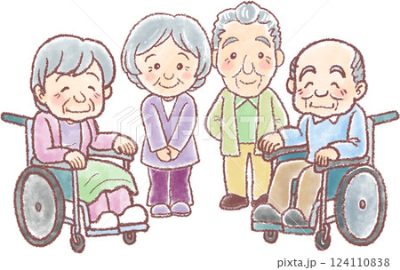 介護のイラスト_高齢男女4人_高齢夫婦_車椅子に乗った高齢男女