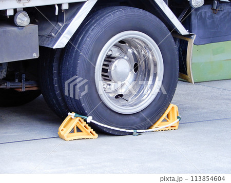 停車中のトラック 前輪タイヤと輪留め
