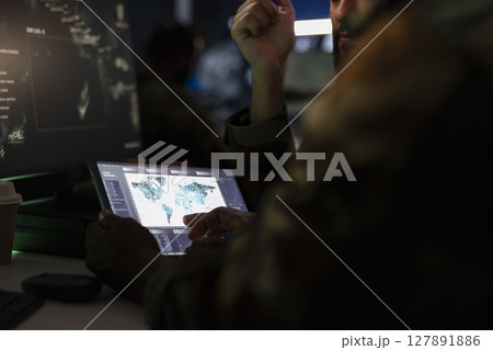 Military officer using tracking software to be able to offer info to front lines commander. Army expert doing reconnaissance to gain intel helping troops, coordinating mission activities, camera B