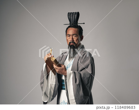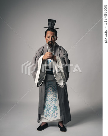 三国志に登場する諸葛孔明のような軍師の全身ポートレート