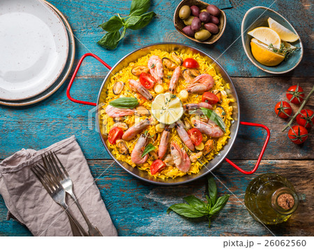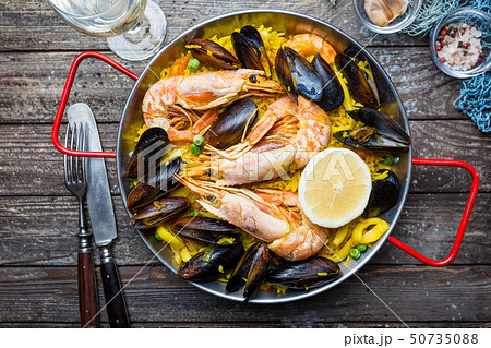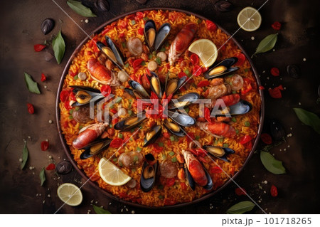 Seafood Paella, Spanish Rice With Shrimp In Pan, Sea Food Paella, Abstract Generative AI Illustration