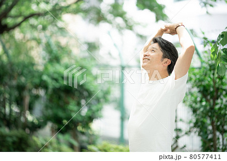 新緑 シニア女性 笑顔 ストレッチ 伸び