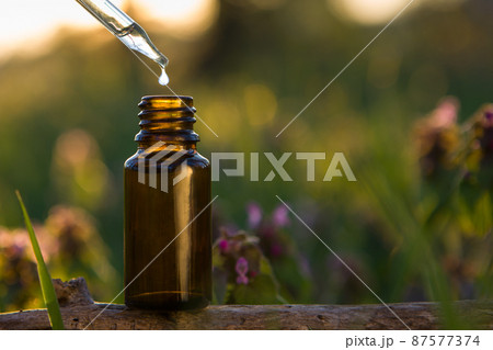 Essential oil dripping from into glass bottle. Herbal essence - alternative medicine.