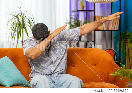 Happy man having fun, dancing, dabbing raising hands, making dub dance gesture at home room on sofa