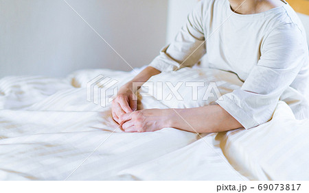 パルスオキシメーターを付けてベッドに横になる女性(顔なし)