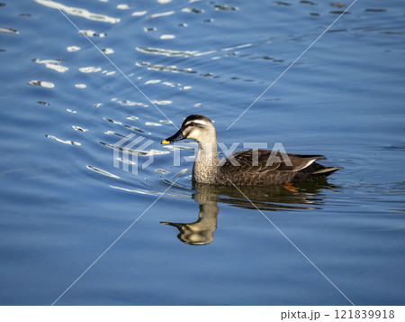 公園の池で泳ぐカルガモ
