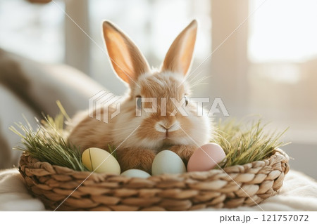 Adorable fluffy bunny sitting in woven basket surrounded by colorful Easter eggs and fresh green grass, bathed in warm sunlight