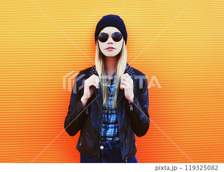 Fashion portrait pretty blonde woman in rock black style on colorful orange background