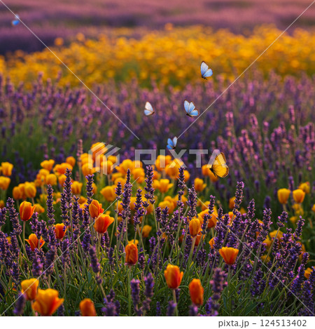 Colorful Flower Field with Butterflies in Spring