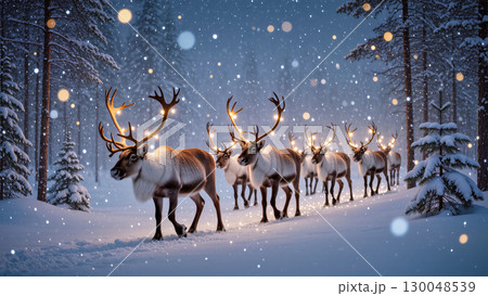 Christmas reindeer walking through snowy forest with glowing antlers, magical winter scene with falling snow and lights