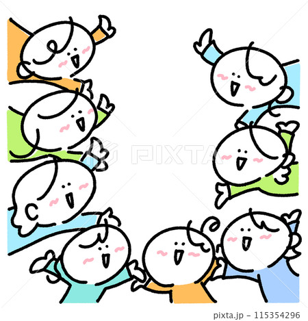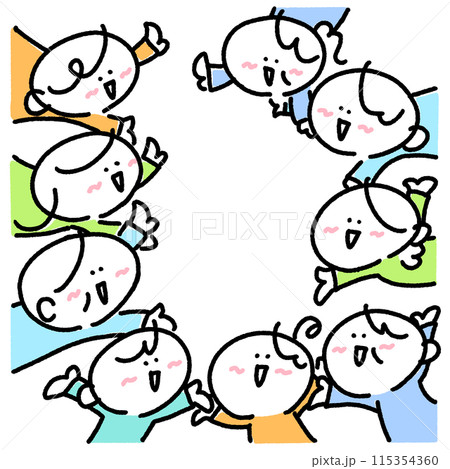 輪になって上を見上げる笑顔の人々 円になる 手描きイラスト