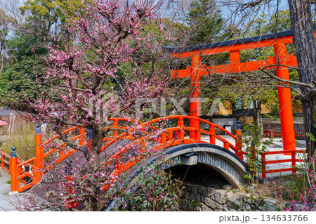 京都 下鴨神社 光琳の梅と朱塗りの輪橋
