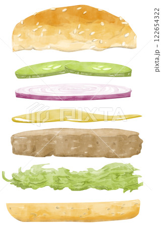 Watercolor Illustration with Burger in Flight: Bun, Pickles, Red Onion, Mustard, Patty, Lettuce for Use in Menu, Printing, Textile and Web