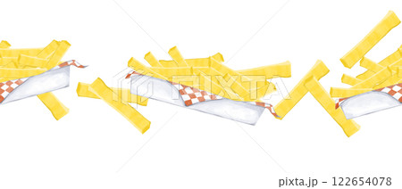 Watercolor Illustration Seamless Pattern Border with French Fries in Cardboard Container with Napkin for Printing, Textile and Web Use