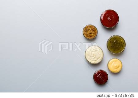 Different types of sauces in bowls on a colored Board . Top view. various sauces copy space