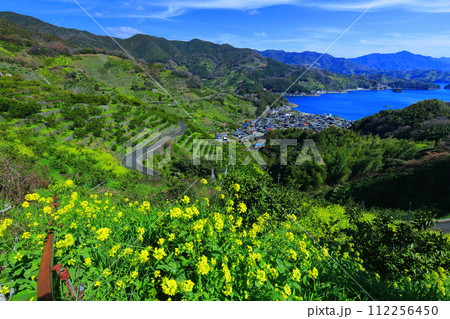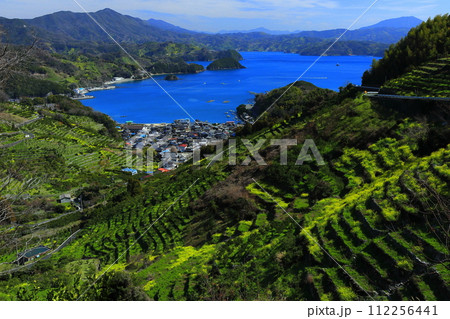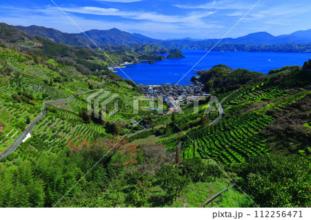 【愛媛県】晴天の宇和海狩浜の段畑と農漁村景観