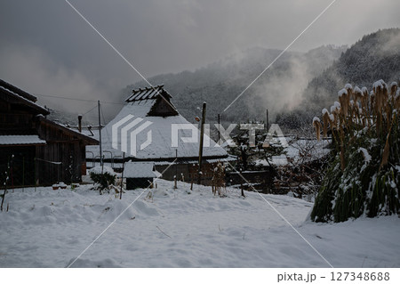 京都府南丹市美山町雪積もるかやぶきの里の撮影したもの