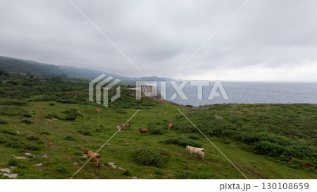 Cattle enjoying the pasture on a cloudy day by the coast of the cantabrian sea in Llanes, Asturias, Spain