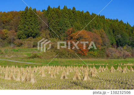 稲刈り後の田んぼに並ぶわらぼっち 日本の伝統的な田園風景