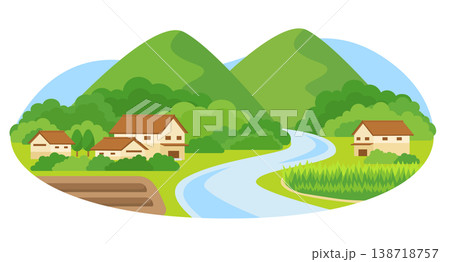 田舎の田園風景を抽象的に描いたシンプルなフラットデザインイラスト
