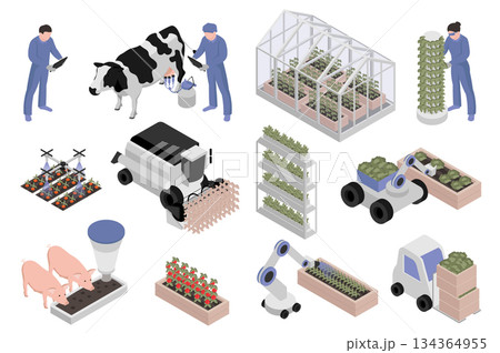 Greenhouse farming isometric elements constructor mega set. Creator kit with flat graphic farmers, livestock, smart planting automation machinery, harvesting. Vector illustration in 3d isometry design