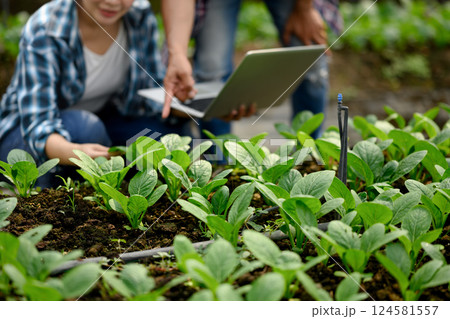 Farmers inspecting green plants and using laptop in a greenhouse. Agricultural innovation concept