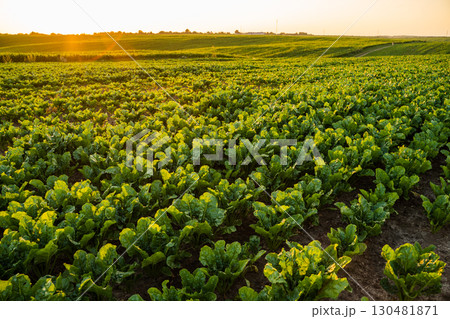 Rows of sugar beet plants in farmland soil under warm sunset sunlight