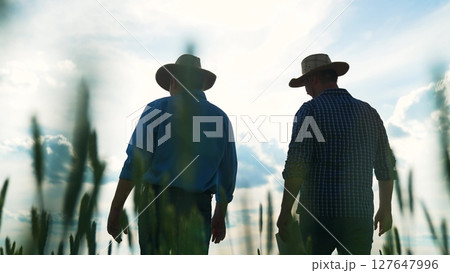 agriculture, businessmen two farmers wheat field, two farmers walking through wheat field, men working green wheat field, businessmen field, growing grain crop, grain harvest, industrial production
