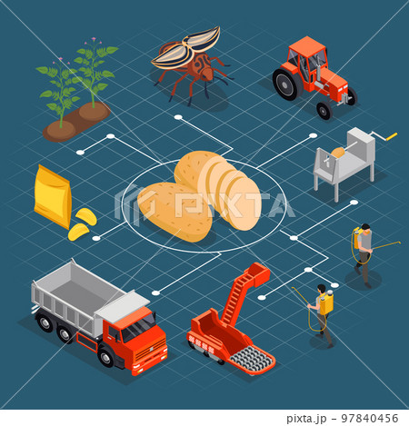 Potato chips production vector infographic. Harvesting. Processing and packaging line, distribution, sale. Food industry