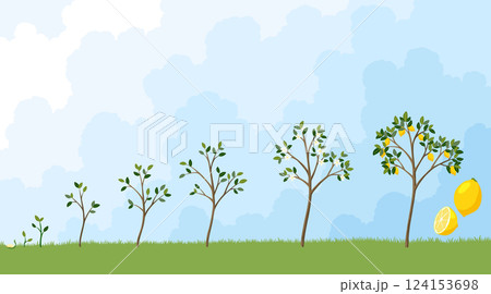 Life cycle of lemon tree. Stages of growth from seed and sprout to adult plant with fruits