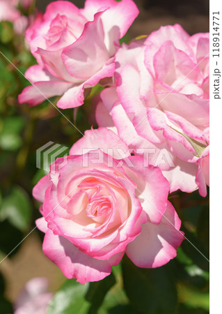 花壇に咲く花びらの縁がピンク色のバラ花壇に咲く花びらの縁がピンク色のバラ
