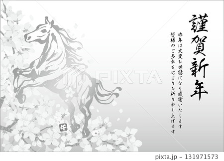 年賀状<葉書テンプレート・午年・2026年・令和8年・桜・横位置・文字縦書き・白黒・墨絵・筆文字>