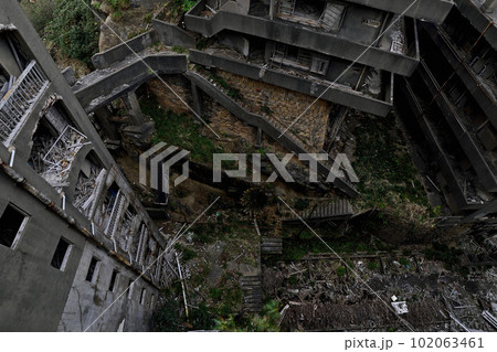 軍艦島に残る56号棟横の五十段